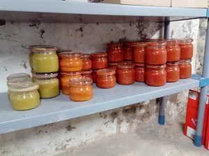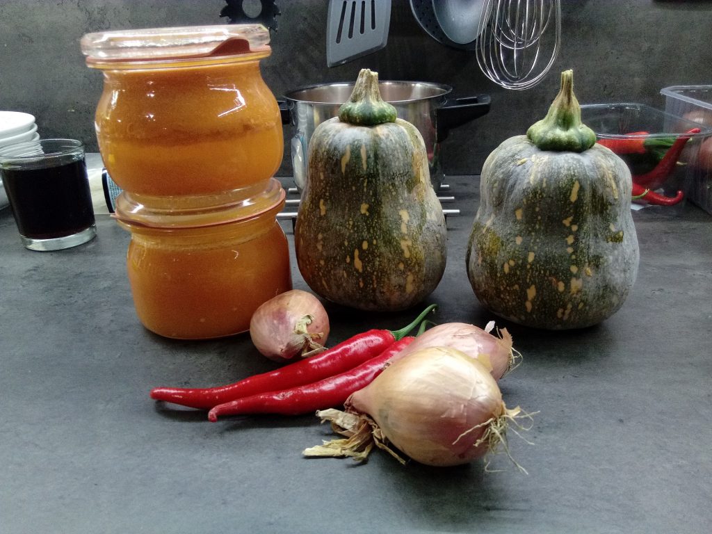 En de butternuts zijn een “flop” :-)… De butternut die ik van een collega had gekregen stond blijkbaar nogal kort bij de courgettes. De zaadjes die ik dus indertijd uit de butternut had gehaald waren dus een kruising tussen een butternet en één of andere courgette-soort. Gevolg… vreemde peer-vormige groene pompoentjes met oranje stippen :-). het ziet er niet uit, maar met een pot tomatensap van oranje (en dus iets zoetere) tomaten blijkbaar best wel lekker. 2 niet-pikante pepers en en vleugje curry maakt het geheel een beetje scherper.