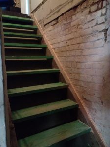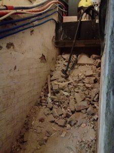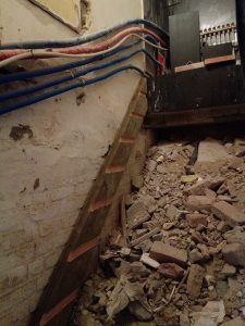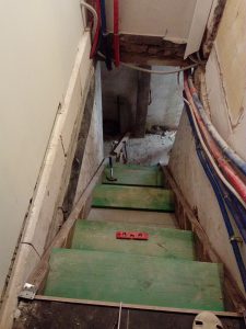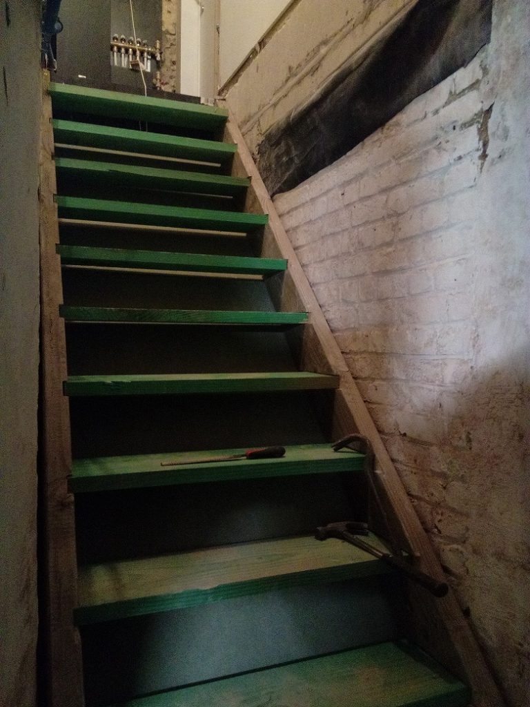 De ketel, warm water, aansluitingen gas … en de wijn… Probleem: geen trap… gewoon een groot gat waar nog massas puin ligt, een stoffige kelder, veel vuil, … Dus een lekkere fles gaan kiezen (of na aankoop wegleggen) was steevast een pad van witte voeten door de living.