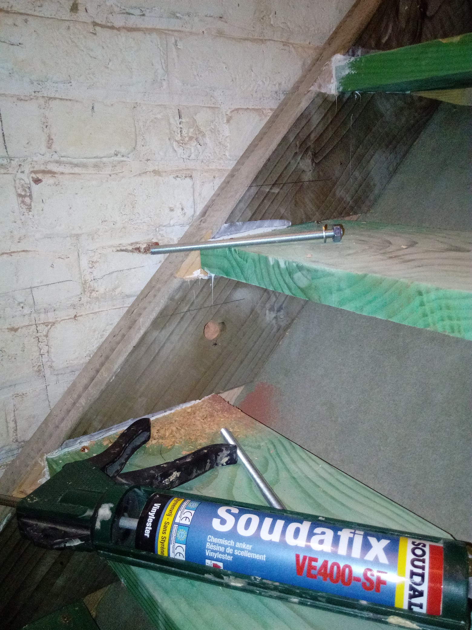 De trap was een feit… maar steunt nu gewoon bovenaan tegen een multiplex plaat en onderaan steunt die op een oude keldervloer. Om deze te fixeren werden er nu gaten geboord en schroefstang op maat gezaagd. Deze werden verankerd met een chemisch anker van soudal in de wanden. Deze trap ging na 10minuten niet meer lopen!