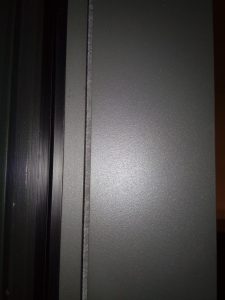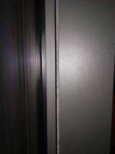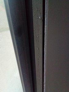 Op foto kan je zien hoe de aansluiting van het vaste deel en het schuivende deel zou moeten zijn (zoals dat bovenaan is). In het midden is een spleet waardoor de buitenlucht gewoon naar binnen geblazen werd. Daardoor koelde het profiel zo hard af dat het door de binnenlucht begon te condenseren.