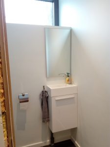 De uitdaging: het bochtenwerk in de kleine lavabo, de doorvoer natuurlijk weer nét ter hoogte van een schroef en alles met 1 keer lijmen en van de eerste keer tegoei natuurlijk :-). De mengkraan is een plaatje en het meubeltje mooi fijn. Het raamprofiel moet nog op “een” manier proper gemaakt worden… daar hangen nog pleister-resten op.