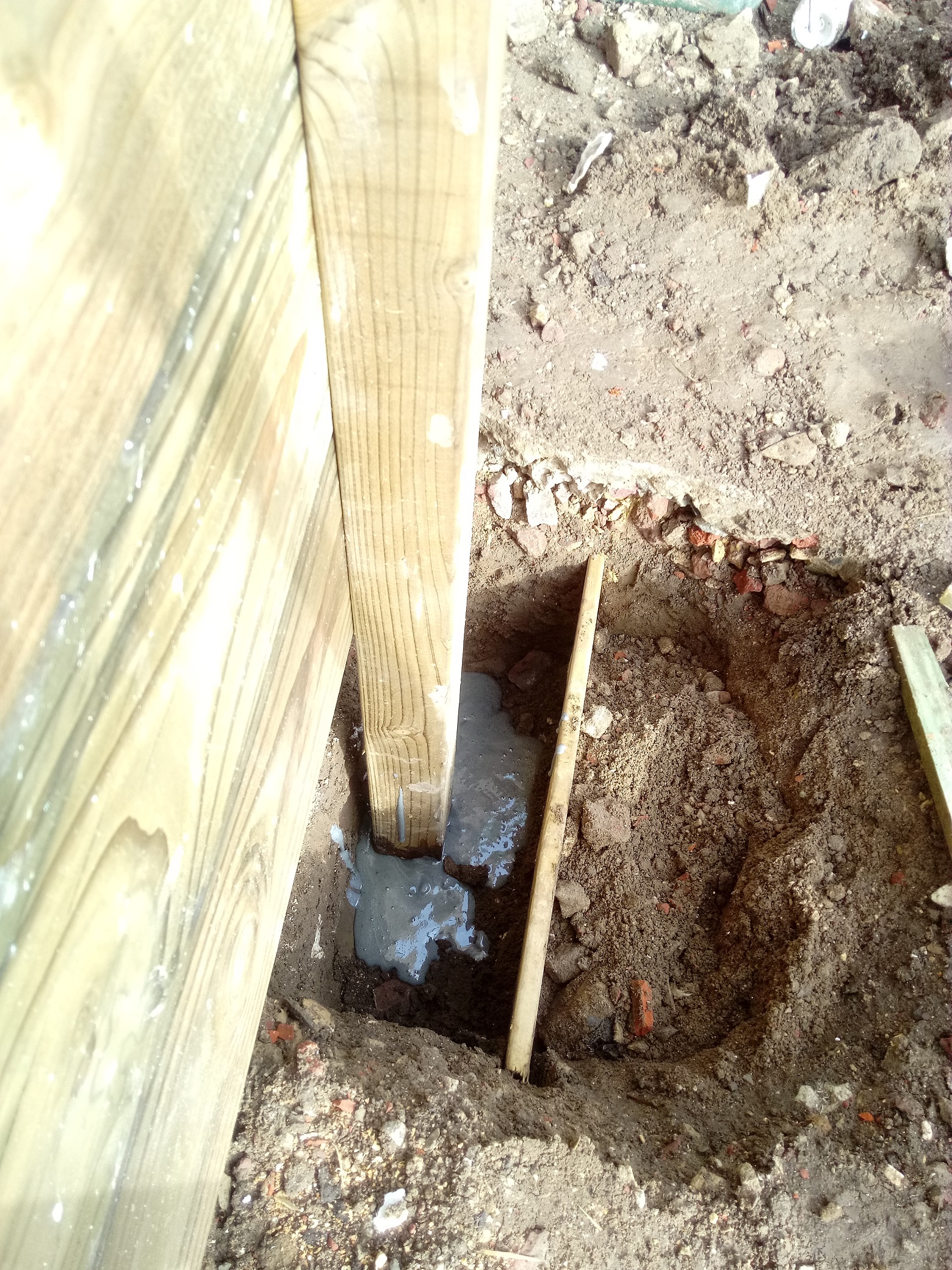 De palen werden eerst verankerd met een 2-componenten-hars. Geen fan van… maar het werkt wel relatief “ok”. Na een schuimlaagje van +-20cm werd de rest met beton gedaan.