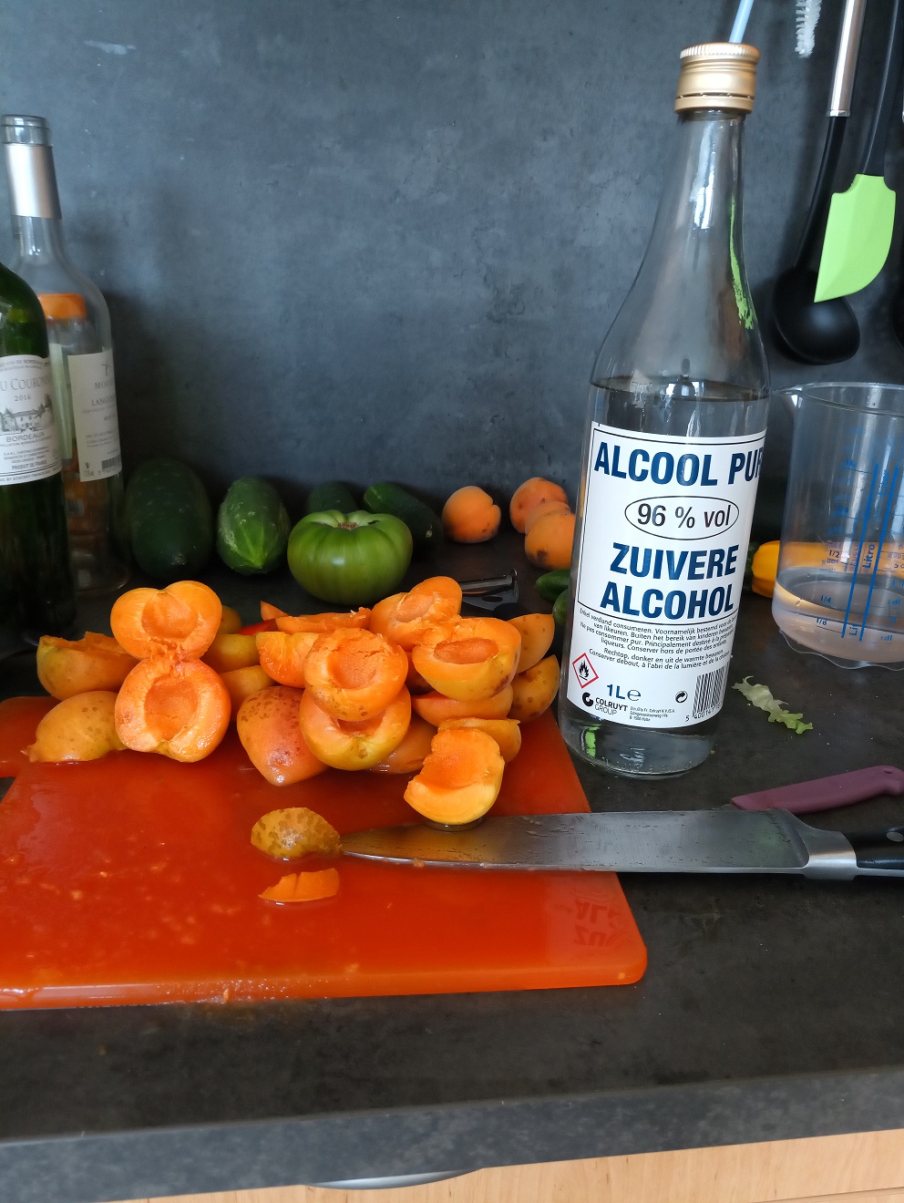 Hup naar de Colruyt en die avond werd er druk begonnen met moes te maken van de abrikoosjes… de pitten werden zoals in het recept beschreven apart gehouden om te trekken in de alcohol. De rest werd gemengd.