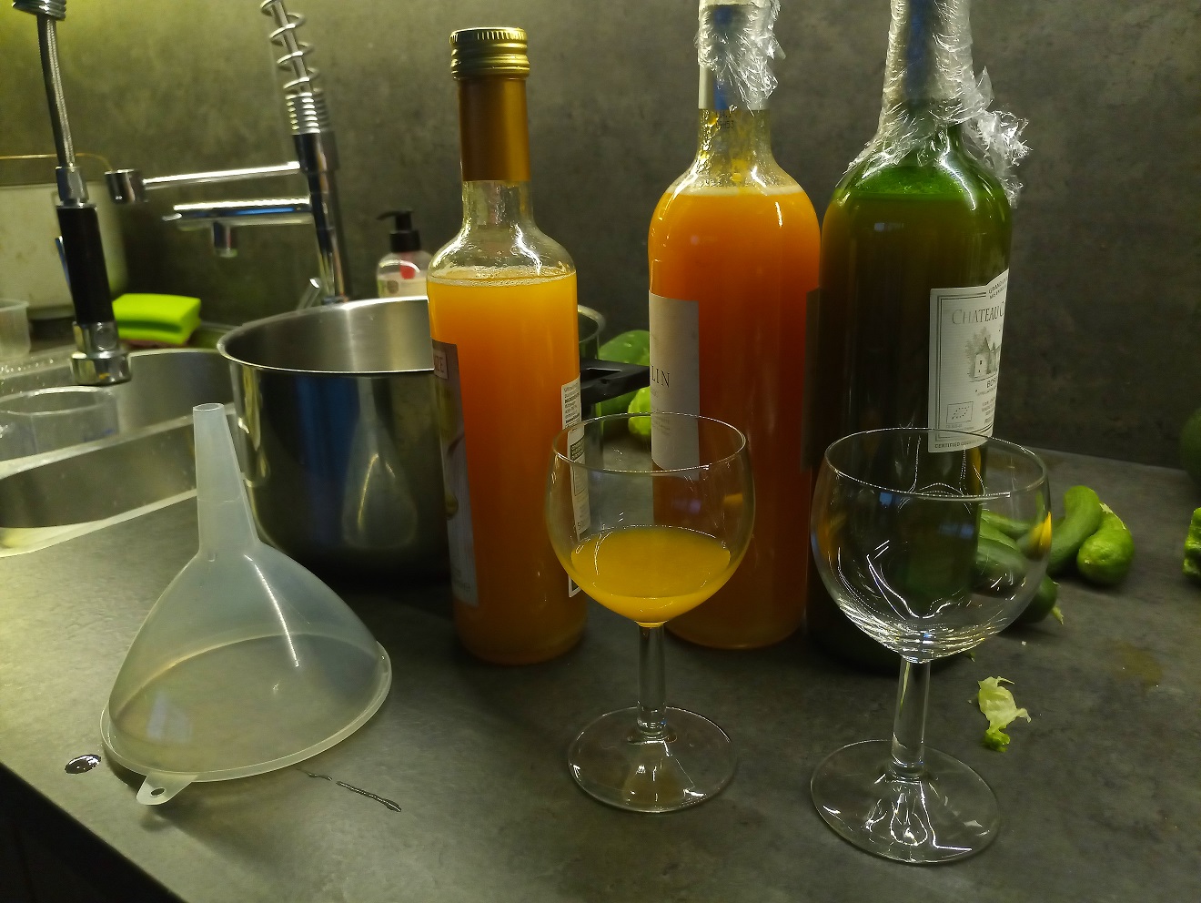Als laatste stap werden er nog flesjes gekocht van 500ml in IKEA. Deze sluiten mooi af. Het mengsel werd bovendien ook nog uitgefilterd door een koffiefilter waardoor het pulp van het sap achterbleef maar de smaken van de abrikozen nog in de likeur behouden blijft. De kleur is dan gewoon helder met een verdoken oranje schijn, de geur is mega-overheersend abrikoos, de smaak is niet zo overheersend abrikoos (vermoedelijk door het bittertje dat lag te trekken in de pitten).