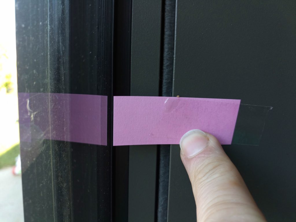 en dan het bizarre fenomeen … een post-it werd op een middag op het schuivende deel geplakt op het profiel. Op die manier dat het uiteinde NET tegen het glas stond van het vaste deel. De volgende ochtend zat dit papiertje op 2 mm van het glas … warmte-werking zal er altijd zijn, maar dit leek me nu toch extreem.
