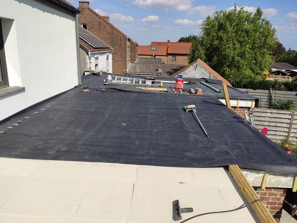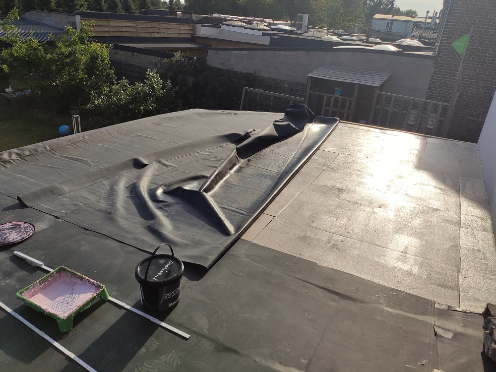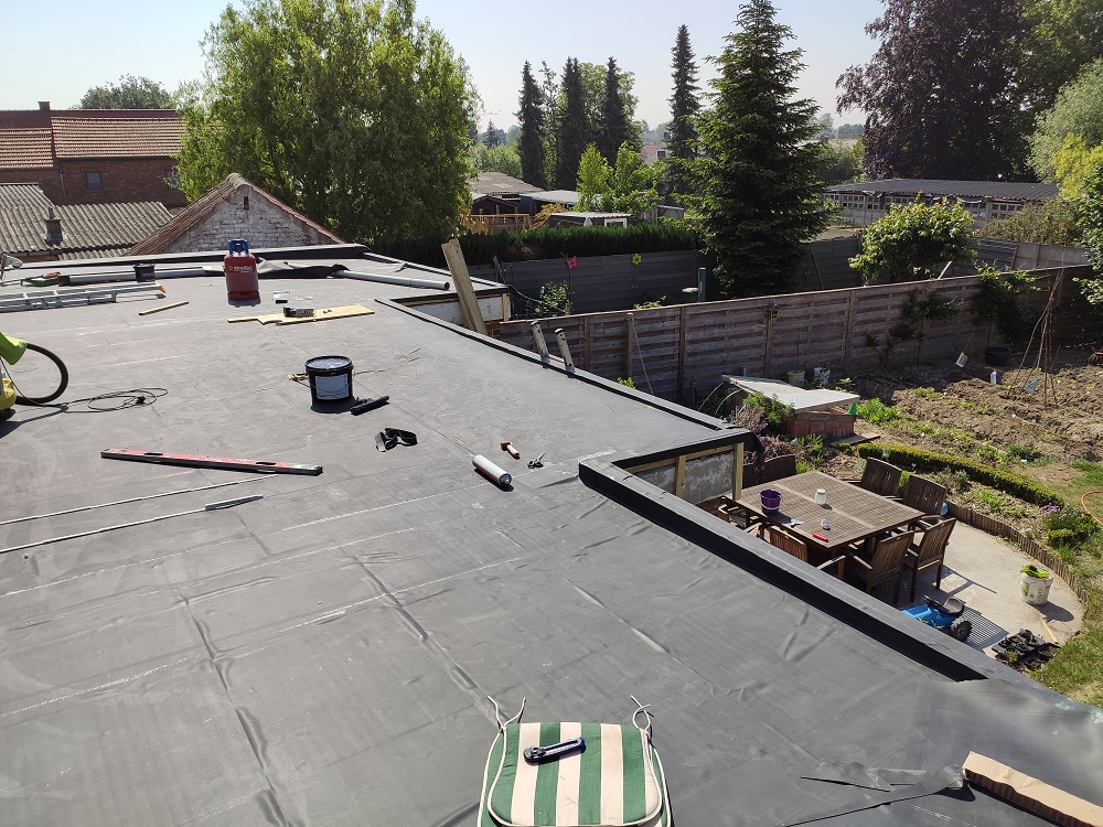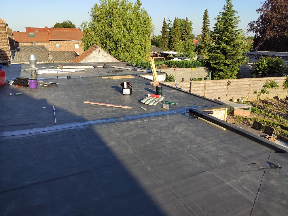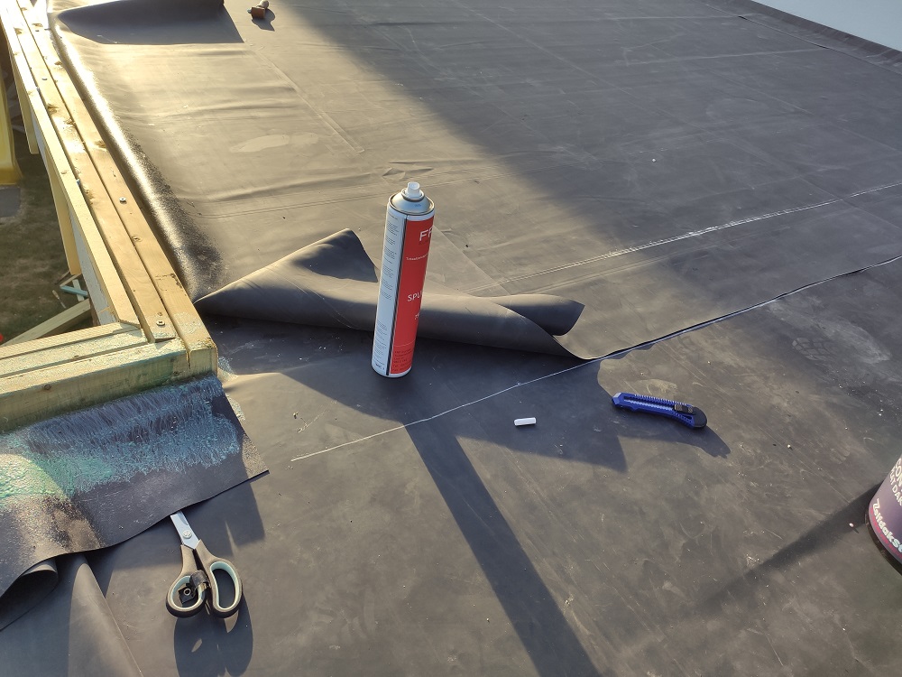 Alles was zo goed als klaar voor het echte werk… De EPDM afrollen, klaarleggen en verlijmen.