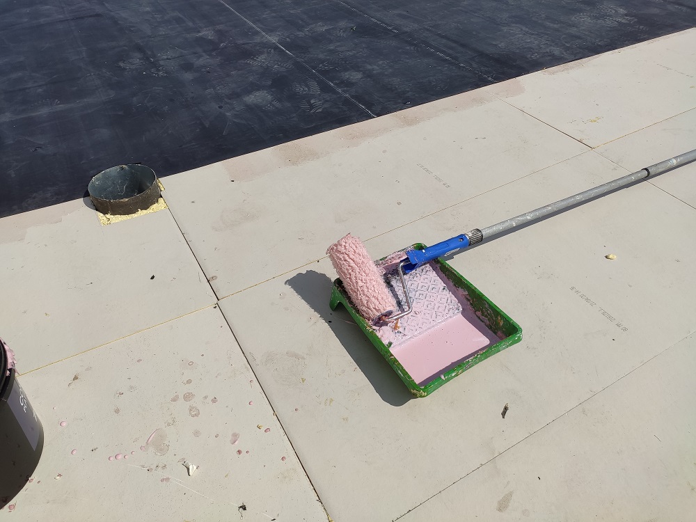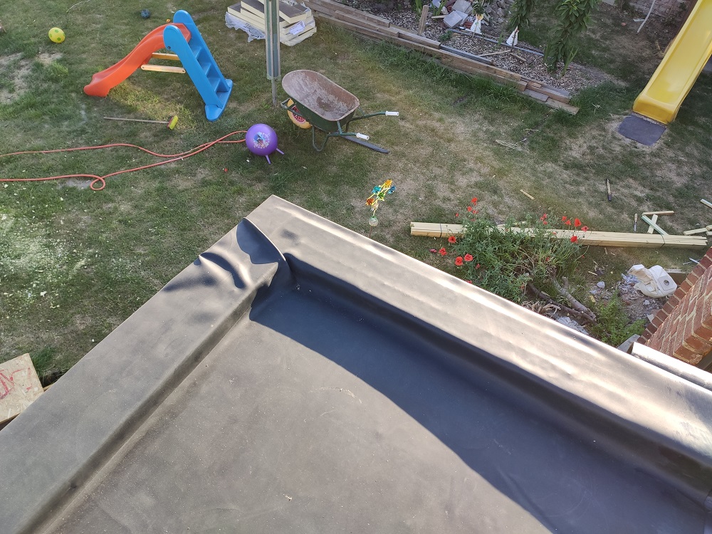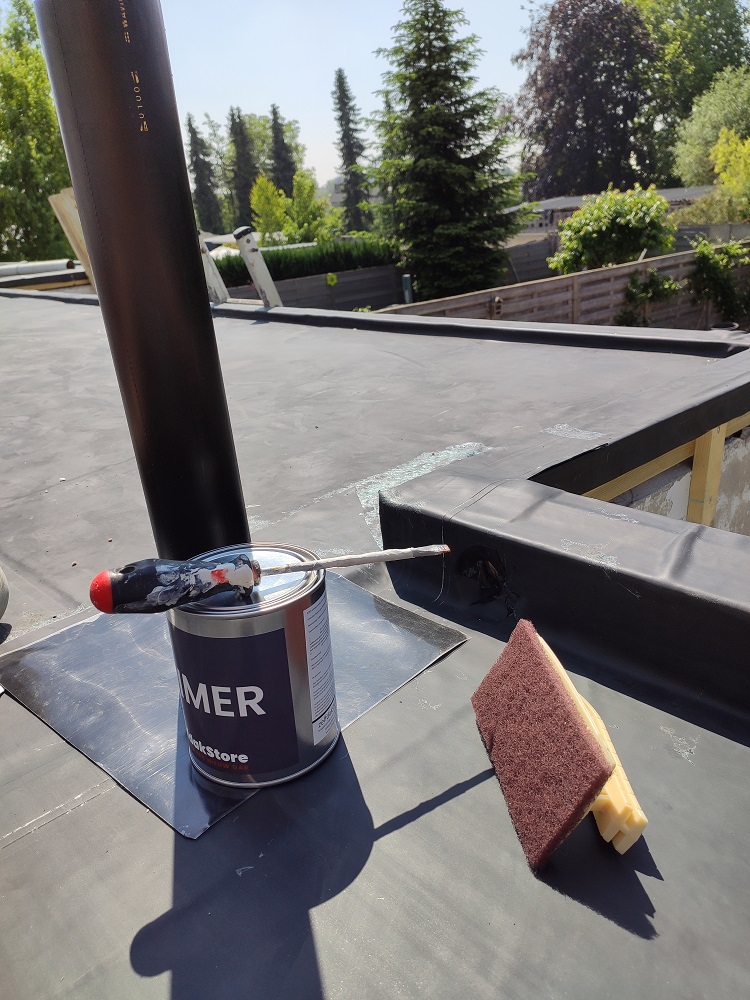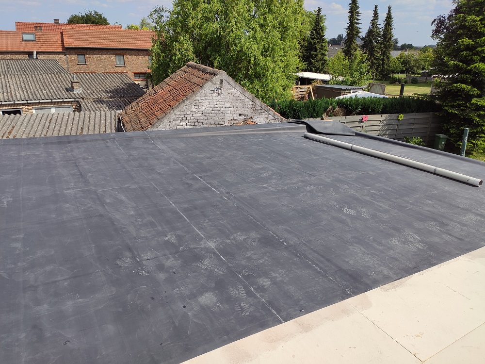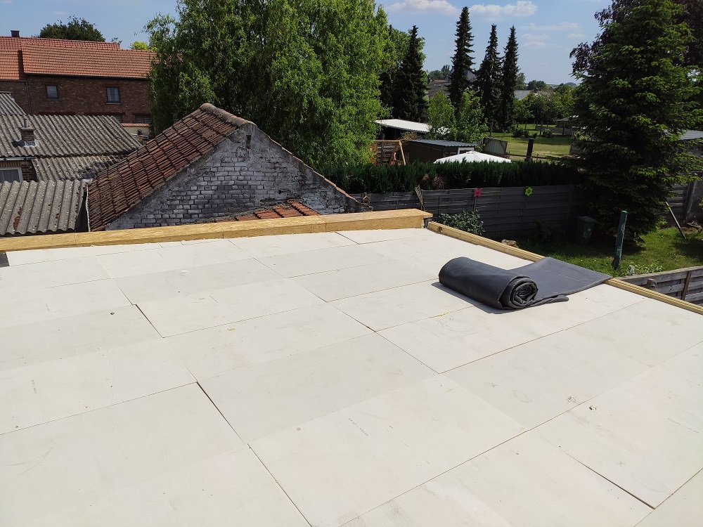 Alles was zo goed als klaar voor het echte werk… De EPDM afrollen, klaarleggen en verlijmen.