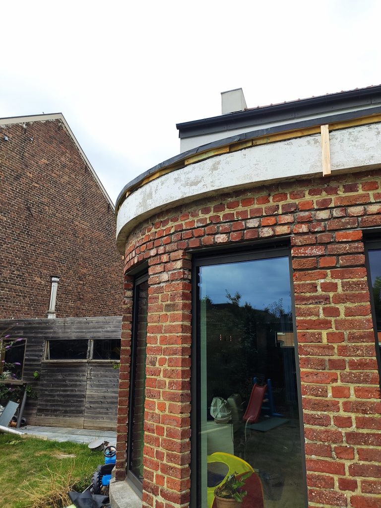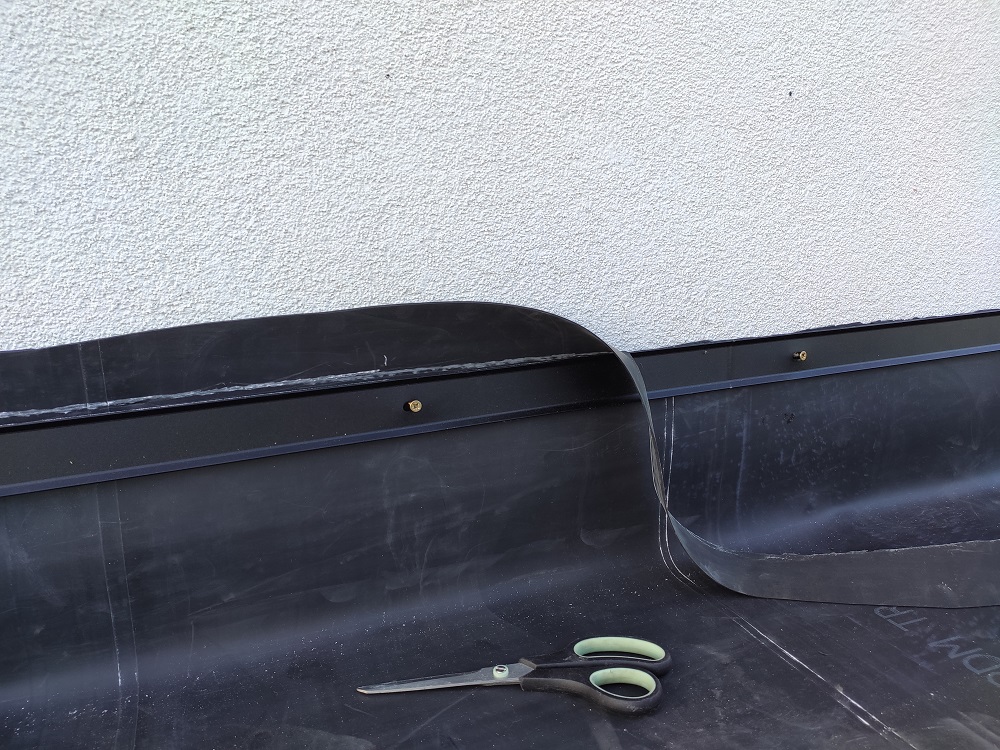 Als laatste nog de opkant op de gevel. Het probleem hier was dat het een crepi gevel is. Normaal gesproken dien je hier een flap in te slijpen en als in de muur aan te brengen. Bij een “na-installatie” is dat helemaal niet mogelijk. Het alternatief is het aanbrengen van een muurprofiel waartussen je de flap rubber gaat klemmen.