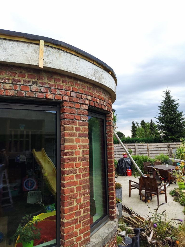 Als laatste moesten nu volgens ons initeel plan de muurpanelen (alu) aangebracht worden en de overzet-dakrand profielen erop aangebracht worden. Daarop wordt nogmaals gewerkt met een zelfklevende band. Dat zal in Part3 komen te staan.