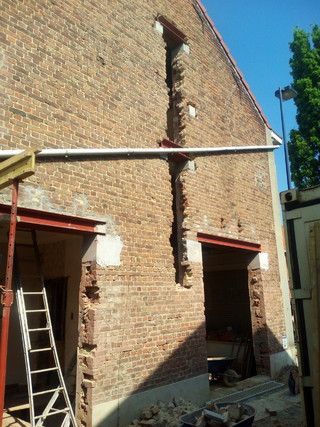 De raamopeningen voor de toekomstige trappen met bijhorende bordessen zijn gemaakt (op foto enkel de rechtse… naast deze kolom komt nog eens eenzelfde opening)Β en de raamopening en het toekomstig portaal zijn voorzien van hun nodige overbrugging.