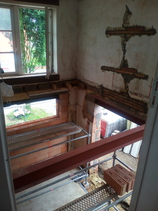 de scheur in de muur werd verder voorzien van verstevigingen. nu aan de binnenzijde van de gevel… duidelijk nog wat plakwerk te gaan alvorens dit weer een mooi afgewerkte kamer zal worden ๐