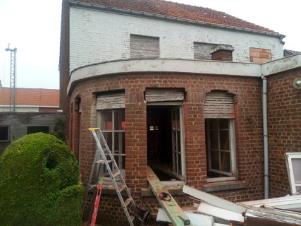 De grote raamgaten(3m op 2m) met oorspronkelijk enkel glas en de deuropening werd opgehoogd.