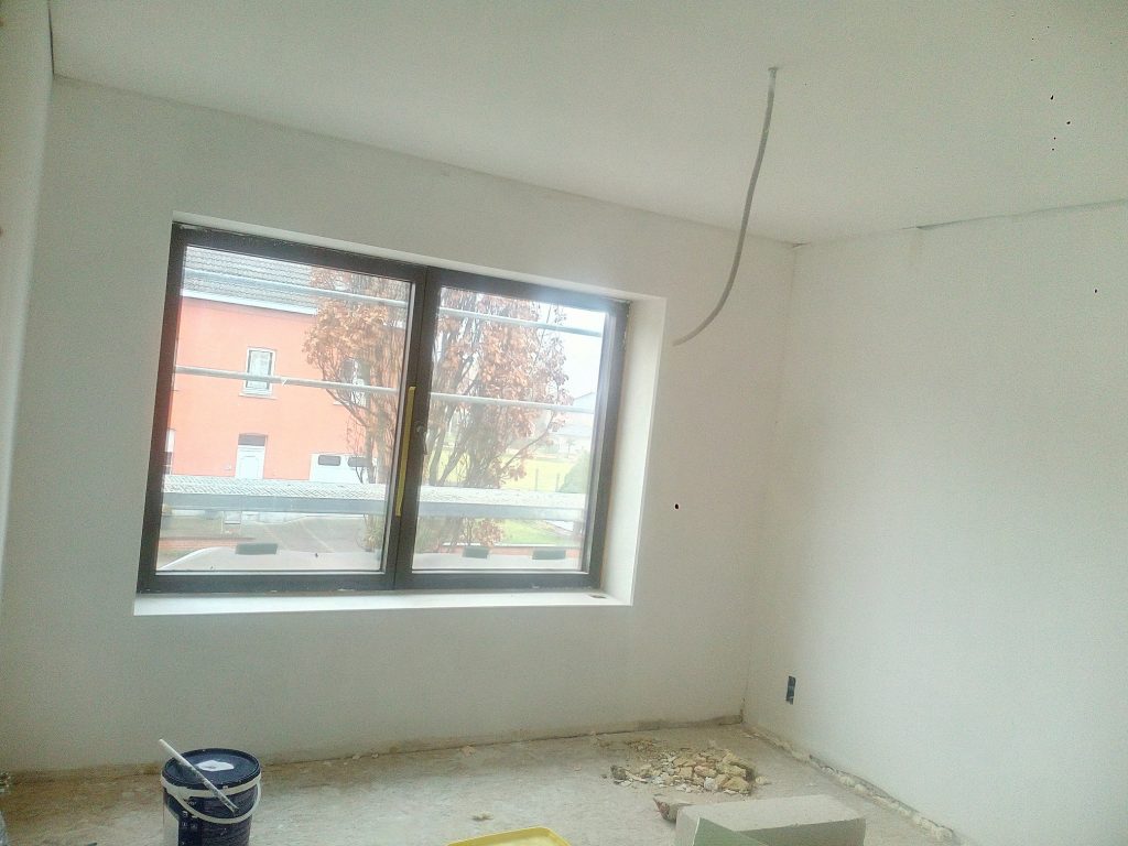 Ondertussen zijn de slaapkamertjes in het stadium gekomen dat ze verder afgewerkt kunnen worden. De muren werden verder uitgevlakt en door de (enorme) verschillen van verschillende structuren hebben we besloten er eerst glasvlies(renovatiepapier) aan te brengen en nadien met verf te werken. Dat gaat meteen verhinderen dat als er een barstje komt of werking tussen de verschillende structeren dat deze niet (meteen) zichtbaar worden… Het was dat of behangen eigenlijk 🙂