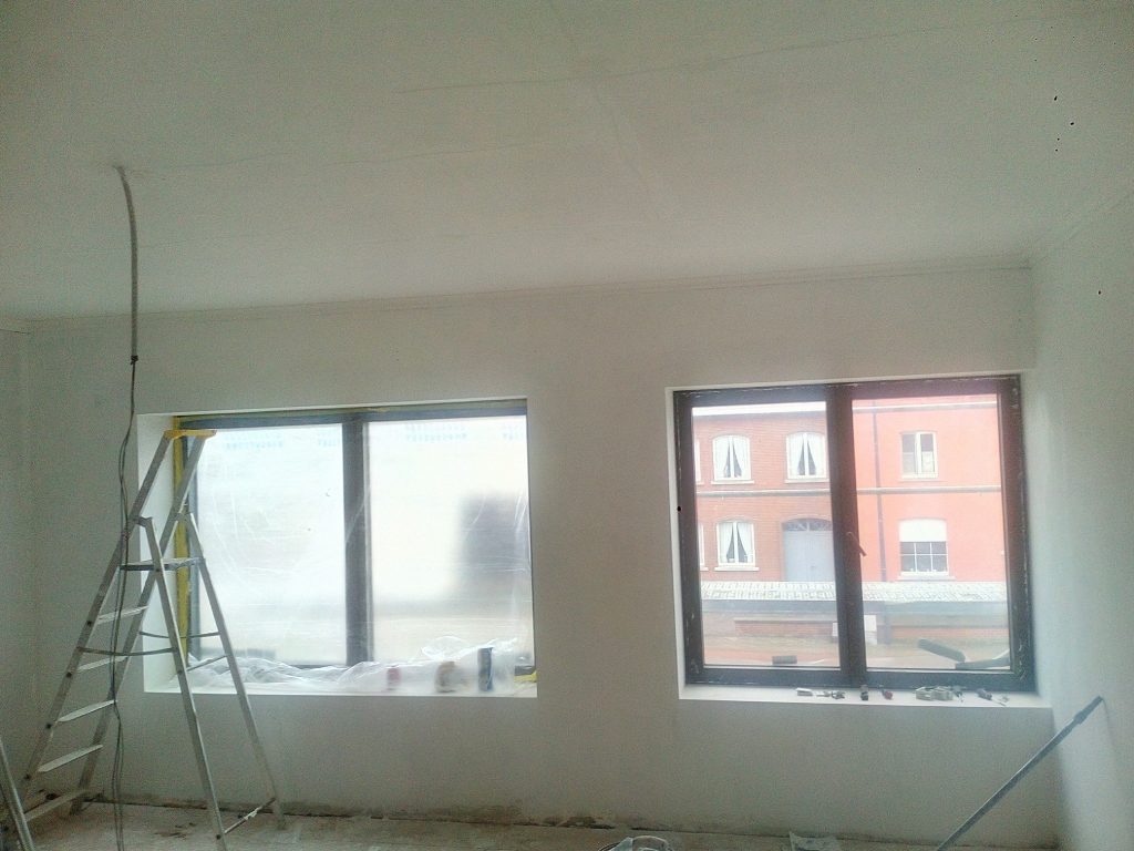 De plafonds in de kleine slaapkamer en hal werden reeds geverfd met de nieuwe levis plafondverf. Die ging écht goed. Vlakt mooi uit, net zoals het moet. De prijs is er ook naar… Waarom geen verf van “the paint factory”… gewoon stomweg vergeten witte verf te kopen :-).