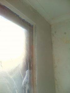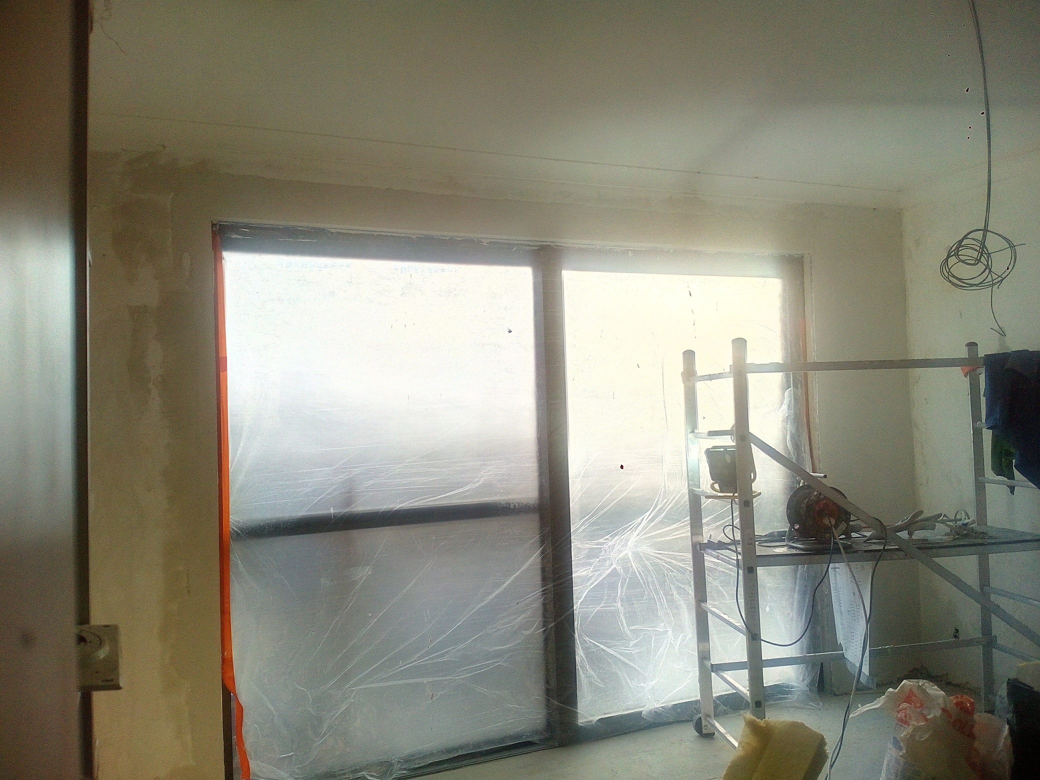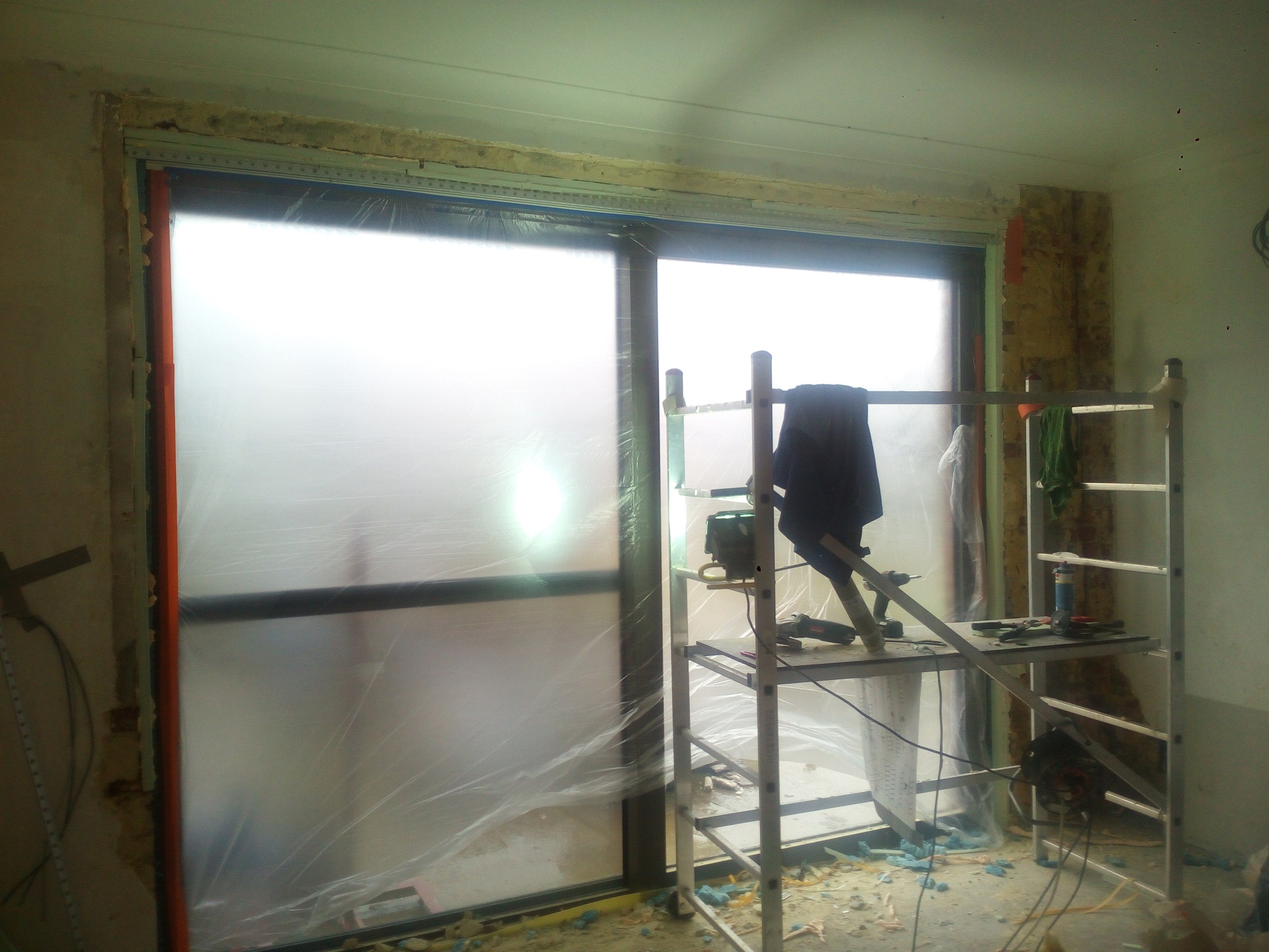 De laatste loodjes beginnen serieus zwaar door te wegen. Het grote schuifraam werd op dezelfde manierĀ als de ramen in de boog ingepleisterd.