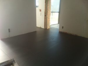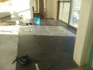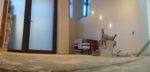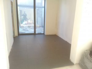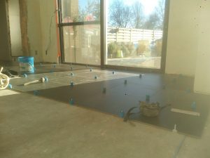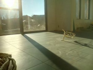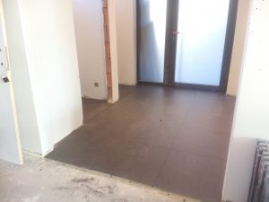 Ook in de vloeren werd redelijk wat vooruitgang geboekt. De carbuurtest was misschien negatief, maar de tegels konden al wel gelegd worden. Het voegsel werd gekozen (antraciet) en valt voorlopig nogal donker uit (in tegenstelling tot wat de vloerders beweerden). Mogelijks is dat omdat alles nog nat is. De tegels zelf waren blijkbaar niet 100-100% recht. Daarom werden de hoeken gelijkgericht. De lange zijden(60cm) hebben een (minimaal) niveauverschil tot een halve mm. BEST wel ok… als ik de vloer zelf zou gelegd hebben zou het waarschijnlijk nog stukken erger zijn :-)…. of zouden de zijden gelijkgericht zijn en de net de hoeken uitsteken en dus pijnlijk worden aan de tenen…