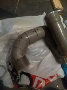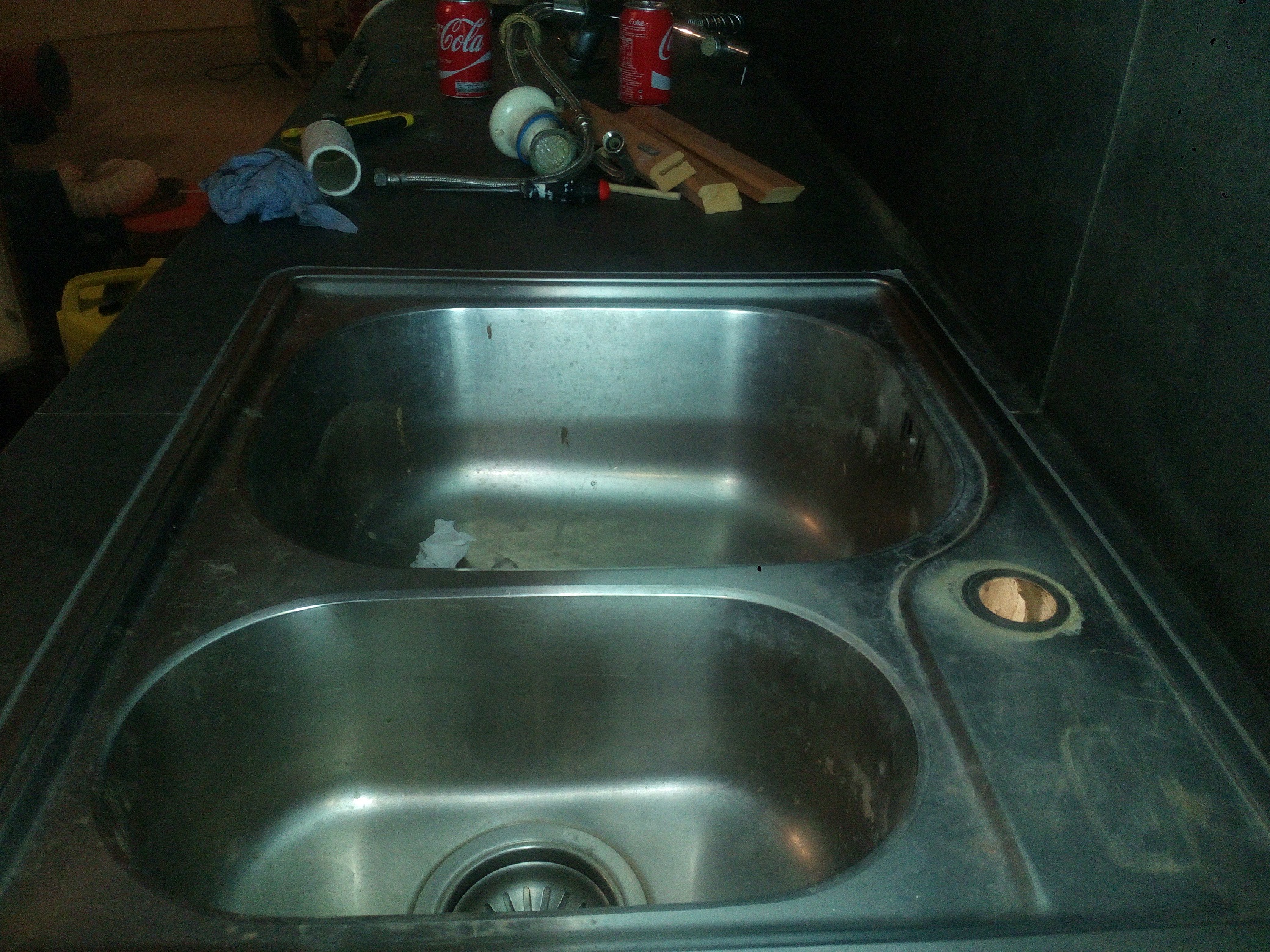 Aangezien de gootsteen nu z’n finale plaats had gekregen kon ik verderknoeien met de pvc-leidingen. Deze werden gelijmd aan de hand van de streepjes die ik er eerder op had gezet toen alles uitgepast werd… het eindresultaat: klopte niet helemaal met wat eerst uitgepast was… reden: geen idee :-)… gelukkig had ik nog 2 stukjes “los” laten zitten zodat er nog marge was om wat te spelen. Na een beetje testen bleek wel alles waterdicht te zijn!