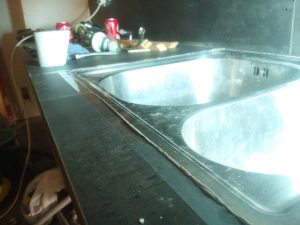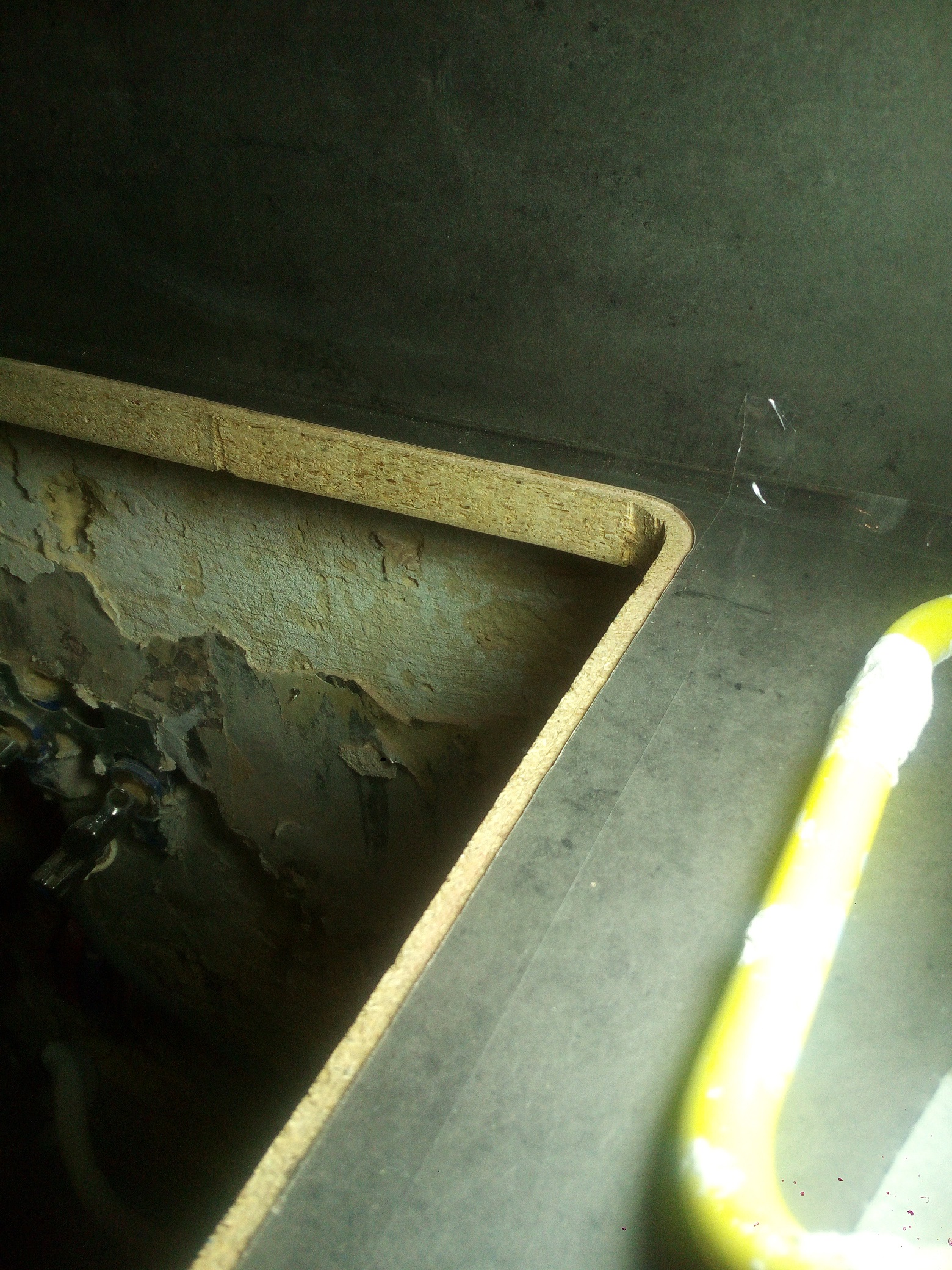 Onderin de gootsteen (was er origineel in 1997 bijgeleverd) waren klemmetjes om de gootsteen aan te trekken op het tablet. Deze werden stevig aangeschroefd waardoor de silicone er langs boven en langs onder uit begon te rollen = ideaal: waterdicht!