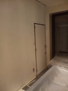 Er werd nog eens een deur geplaatst. De speelkamer begint dus al een stukje veiliger te worden. Vrij belangrijk in functie van de kindjes die niet plots achterin aan de knoppen van de vloerverwarming mogen spelen… of in het gat vallen waar ooit een keldertrap dient te komen :-).