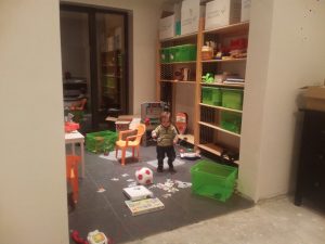 Ook de inrichting is een beetje begonnen. De chappe blijft maar te nat voor het plaatsen van de parket, dus voorlopig hebben we alles maar gewoon “gedropt” as-is op de chappe. Niet optimaal met 2 kleine kindjes, maar het is nu zo. Fijn stof wordt in no-time overal heen gedragen en het is dus een permanent onmogelijke zaak om alles te kuisen.