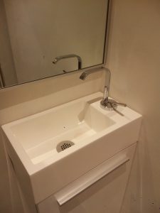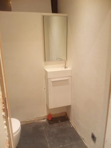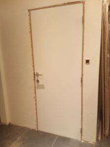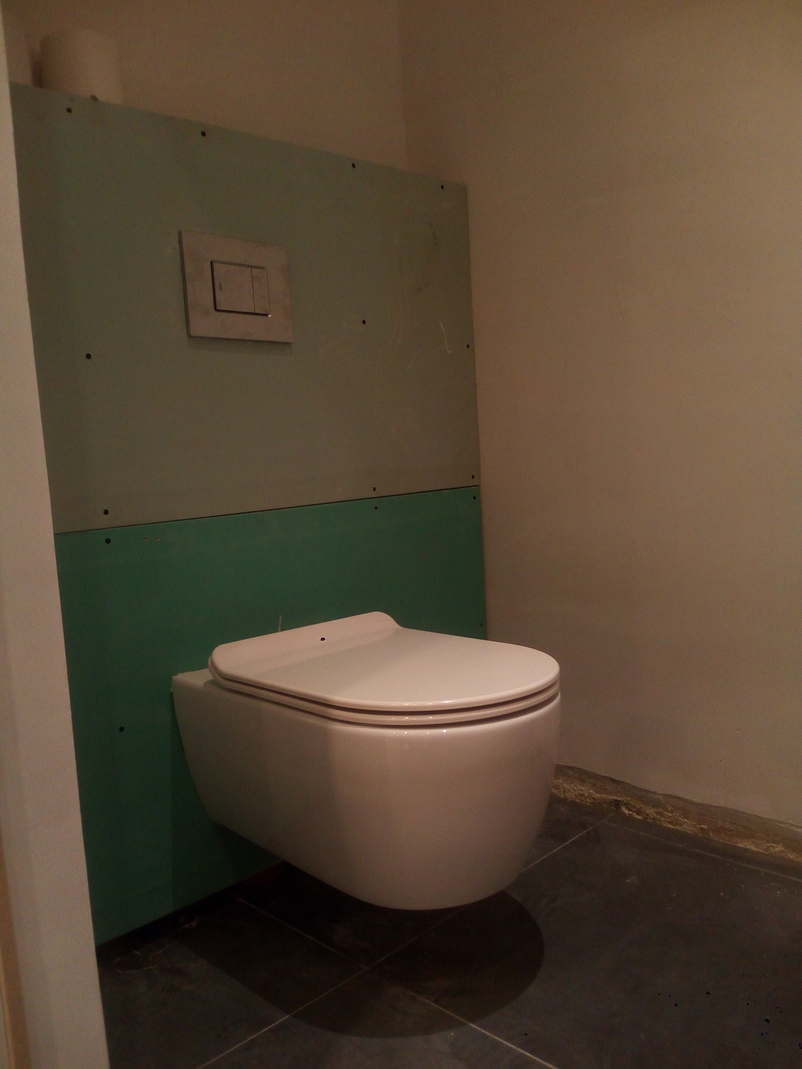 Het toillet beneden (het initiële doel van de gehele verbouwing!!!!) werd in tussentijd ook geplaatst. Best wel een lastig karwij. Een speciaal diamant-boortje was nodig om in de tegels te boren. Zoonlief heeft goed meegeholpen en met de stofzuiger zo goed en zo kwaad mogelijk alles opgeruimd. Tijdens het installeren (of beter nadat alles klaar was) begonnen aan de deur… en gemerkt dat de deur die erin zou moeten staan eigenlijk aan de keldertrap staat en omgekeerd. Dus een nieuwe deur moeten gaan kopen…