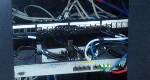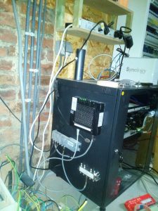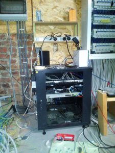 Het was een zootje… onder de elektriciteitskast kwam er (naast de elektrische leidingen) een kluwen van kabels uit…. network, coax. Goed voor een hoopje connecties naar de kamers, naar de cameras, voor de televisies, enz. Om alles proper weg te werken waren er als IT-er 101 mogelijkheden… de meest logische en properste was een “comm-rack” kopen en daar alles in verstoppen.