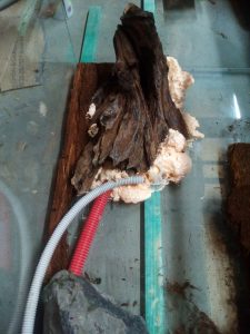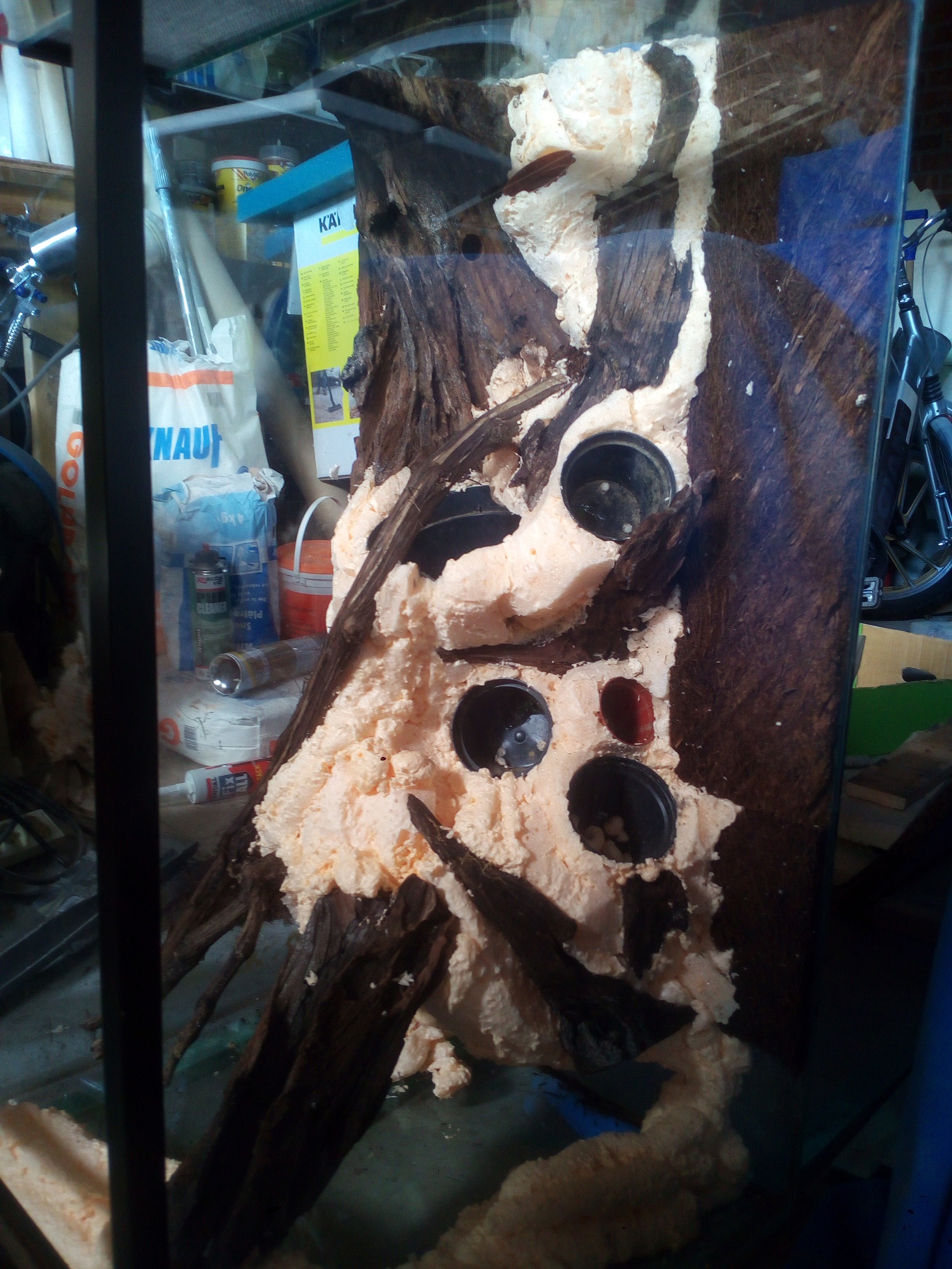 Het doel is een soort stam/boom te maken dewelke zeer natuurgetrouw zou moeten overkomen… Ik had het idee om de waterpartij af te schermen van de rest van de bodem met een groot stuk hout. Dat idee is ondertussen al gewijzigd. het zal (ook) een schuimwand worden die nadien zal ingezet worden met tegellijm en diverse steentjes(rond riviergrind) en rijnzand om zo een soort “oever” te krijgen. Het water zal door een schuimfilter kunnen gaan en opgenomen worden door een pompje die het vervolgens weer naar boven brengt. Het water zal sijpelen langs de combinatie hout-schuim en zal een tussenstopje maken in de grootste (bloem-)pot. Daarin zit een 24v mistmaker verstopt die mee geprogrammeerd zal worden.
