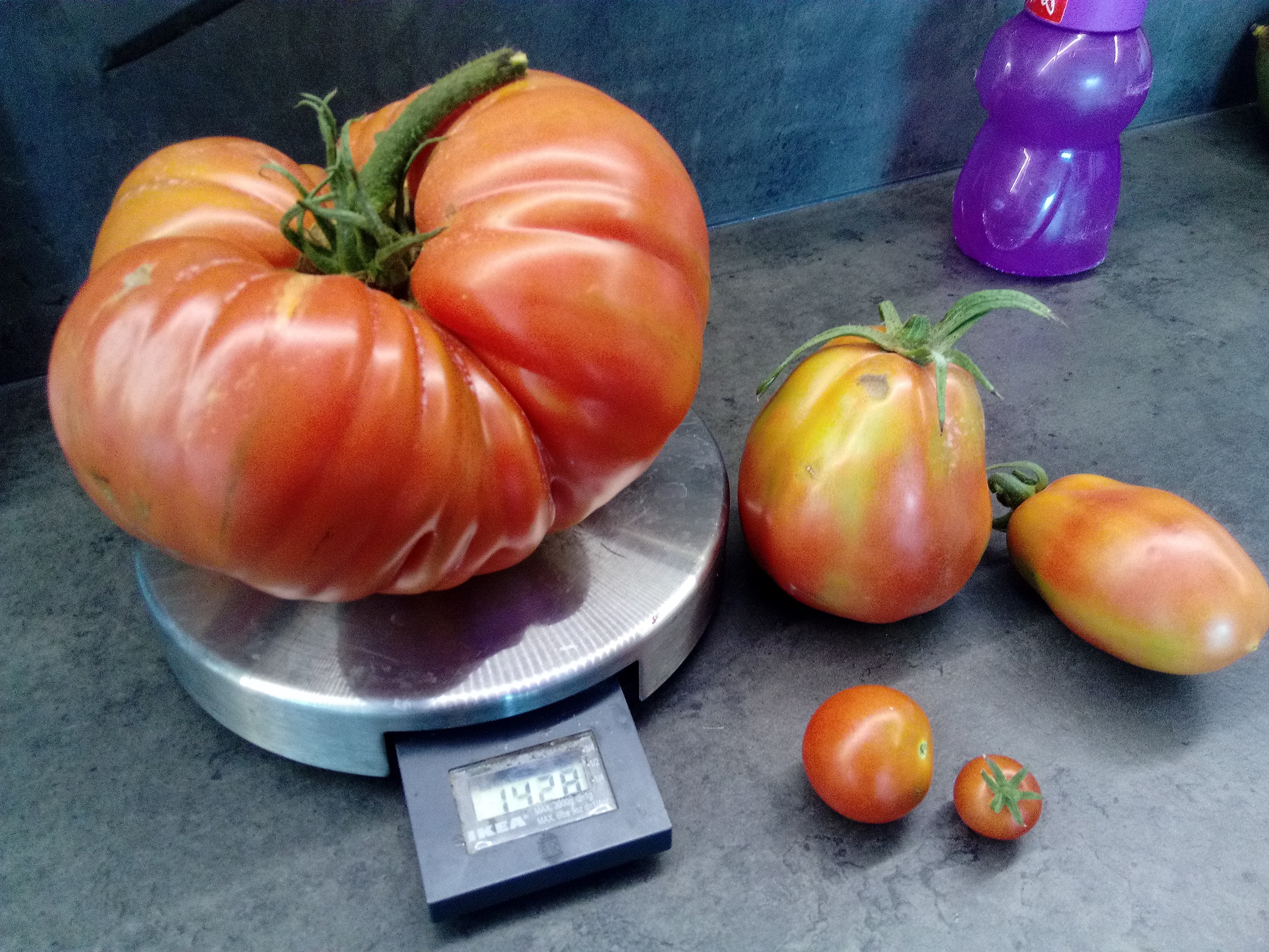 1exemplaar trekt de aandacht: de xxxxl-tomaat van 1428gram 🙂