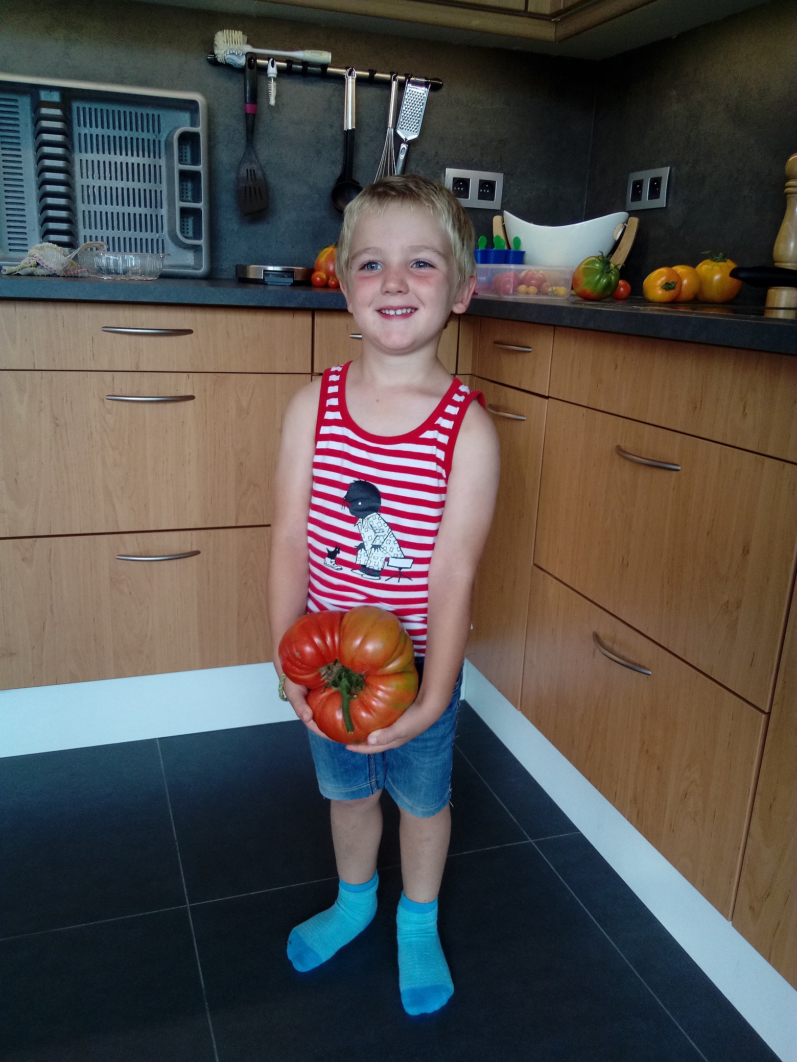 Vreemd, want uit m’n tuin komen de meeste oranje (niet eens de grootste) tomaten met een gewicht van 700gram… enfin… ik ben steeds te vinden voor een uitwisseling en een uitdaging 🙂 volgend jaar gaan we voor de 1.8kg :-). Jammer dat ik geen serre heb, anders zou ik meteen mikken op 2kg 🙂